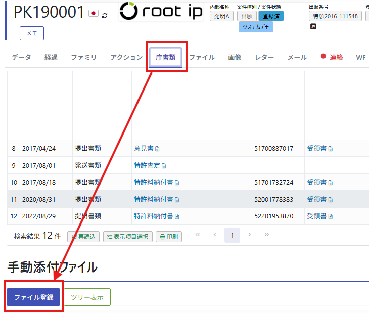 書類一覧は、電子出願ソフトサポートサイトで公開されているひな型を参考にしております。https://www.pcinfo.jpo.go.jp/site/2_download/3_hina/以下書類の取込はroot ipでは取込が出来ませんので、案件の「庁書類」タブまたはファイルタブ等、運用に合わせてファイルを手動登録してください。
