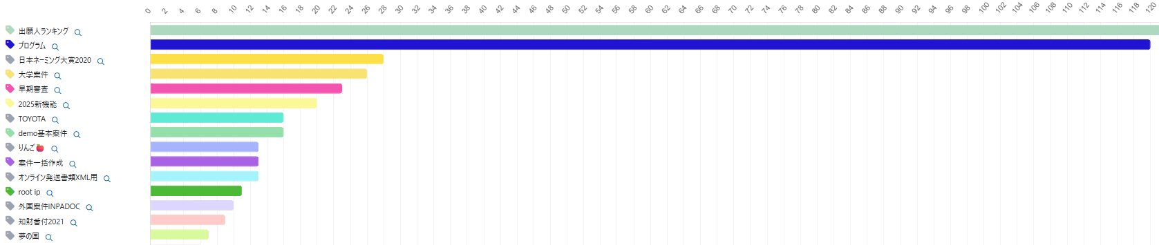 技術分類を「案件タグ」で管理されているユーザ様より、タグ件数を視覚的に確認できるグラフ機能のご要望をいただき、このたび案件タグの件数を棒グラフで表示できるよう対応いたしました。