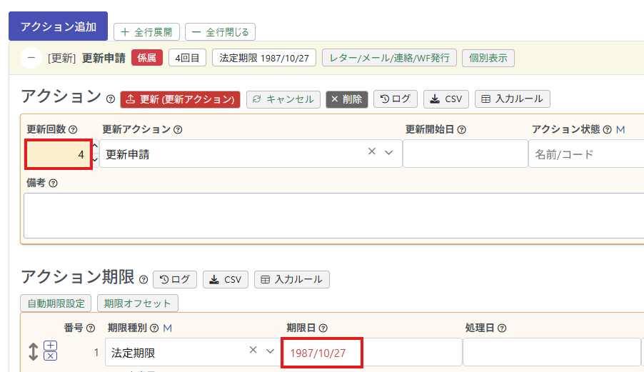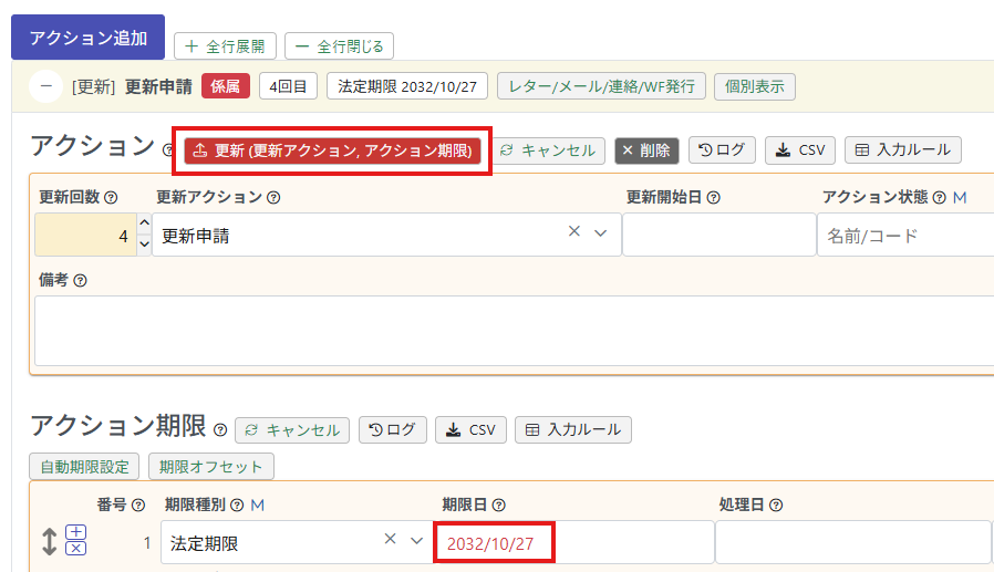 初回の更新アクションが作成されます。権利満了日も初回の更新アクション同様に、更新設定から計算されますので、