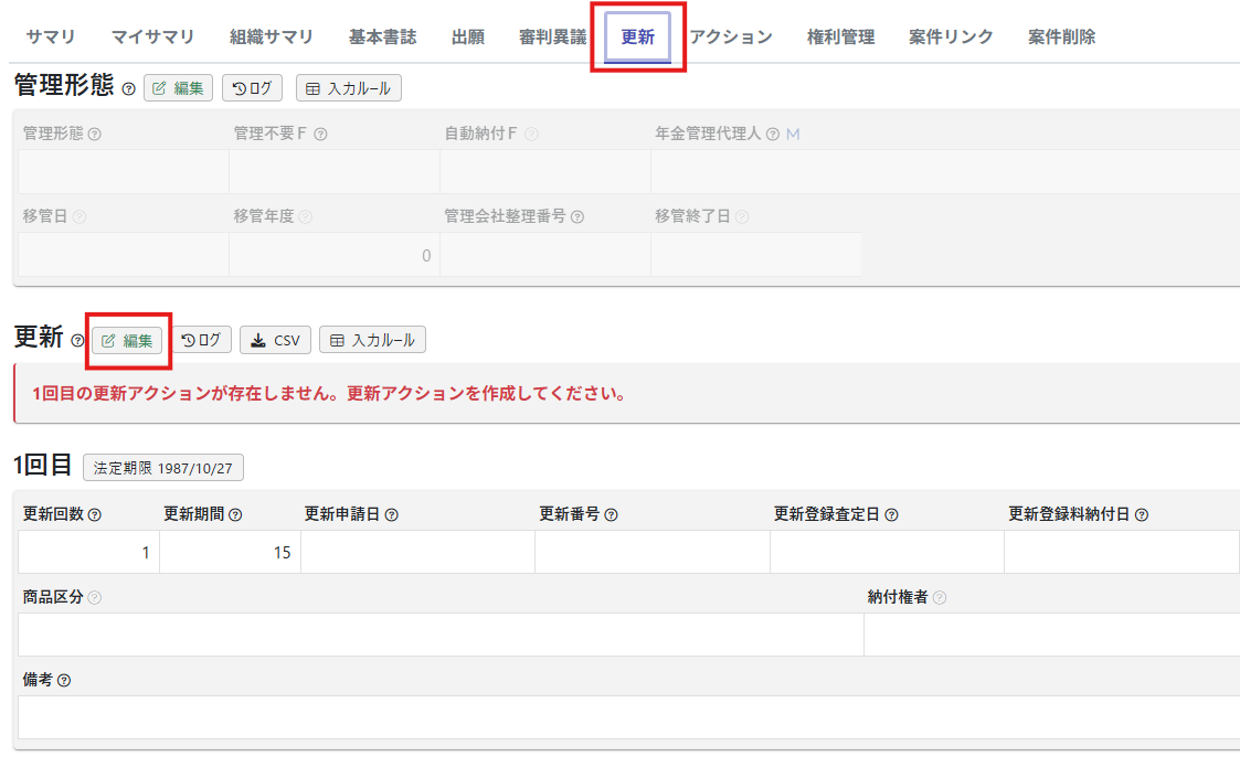 - 1回目の更新申請アクションの「編集」をクリックし、更新回数に次回(最新)の更新回数の数字を入力する