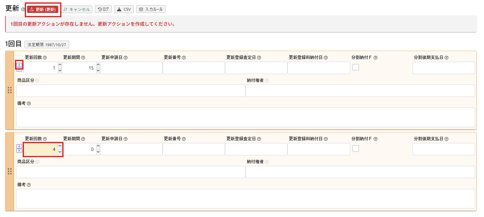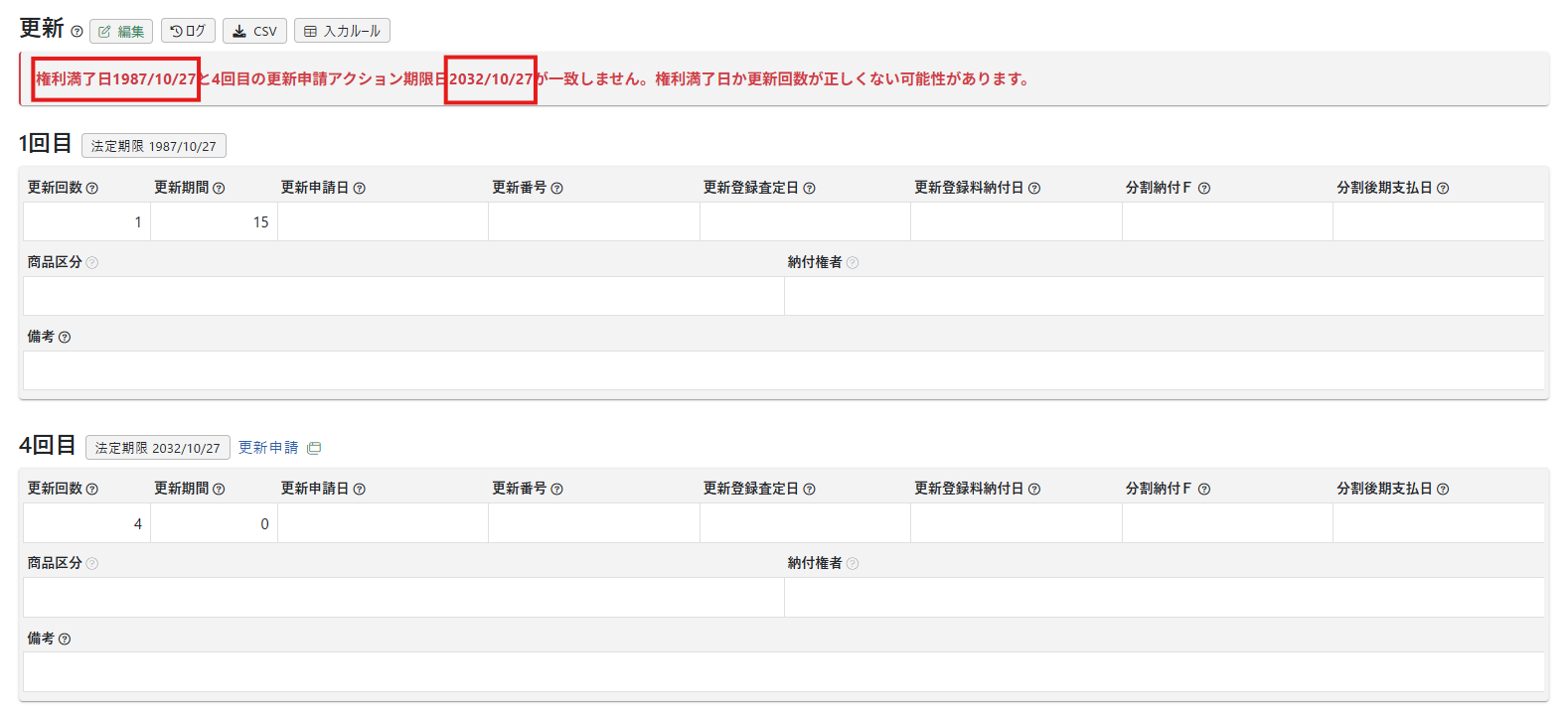 - 更新テーブルを追加したことにより「権利満了日●●●●/●●/●●と〇回目の更新申請アクション期限日●●●●/●●/●●が一致しません。権利満了日か更新回数が正しくない可能性があります。」とアラートが表示されます