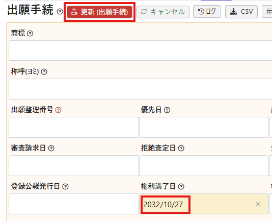 - 出願タブ>出願手続テーブルの「編集」をクリックし、権利満了日に最新の更新アクションの法定期限日と同じ日付を入力して「更新」する