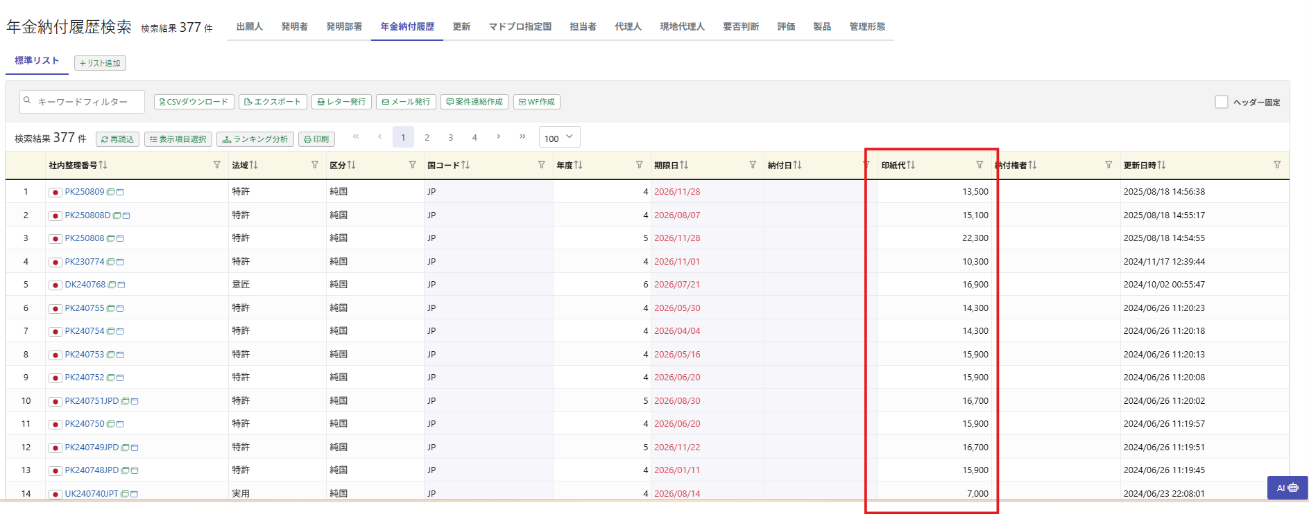 期間を指定して年金納付履歴を子テーブル検索いただくことで、印紙代の一覧取得が可能です。