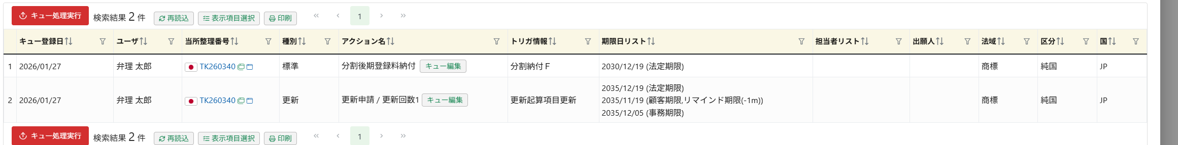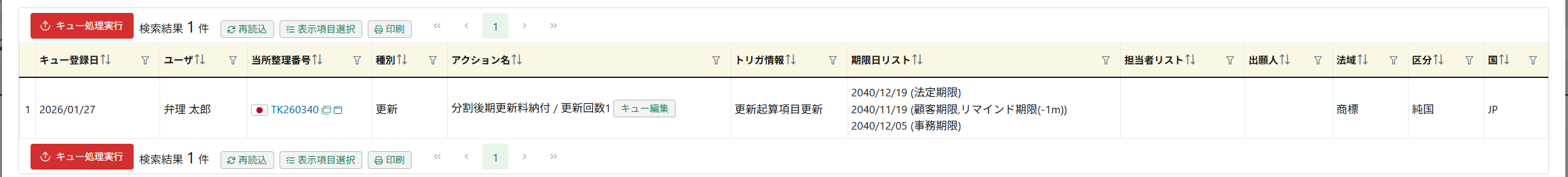 更新申請の処理日に手続した日付を入力すると、「分割後期更新料納付」のアクション作成キューが発生します。