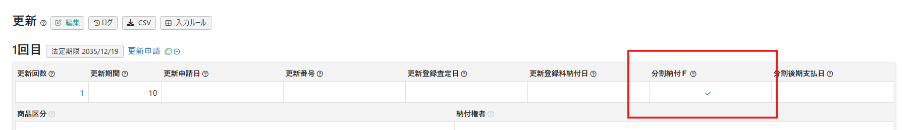 登録料納付を行った段階で案件内 出願>商標書誌テーブルの「分割納付F」にチェックを入れます。