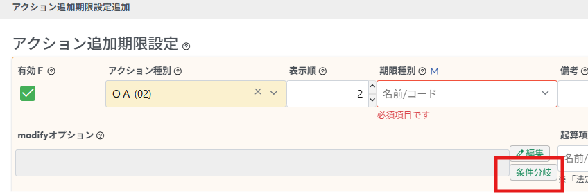 - 「アクション追加期限設定」画面にて、modifyオプション欄の「条件分岐」ボタンをクリックします。