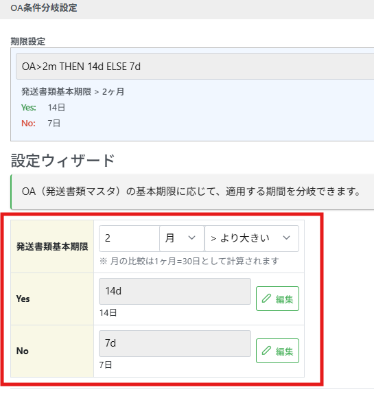 - OA(発送書類マスタ)に設定されている基本期限を基準に、適用する期限を分岐できます。