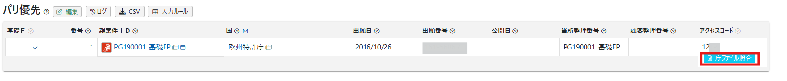 - パリ優先テーブルのアクセスコードは、基礎案件をセットすると自動的に引き継がれます。