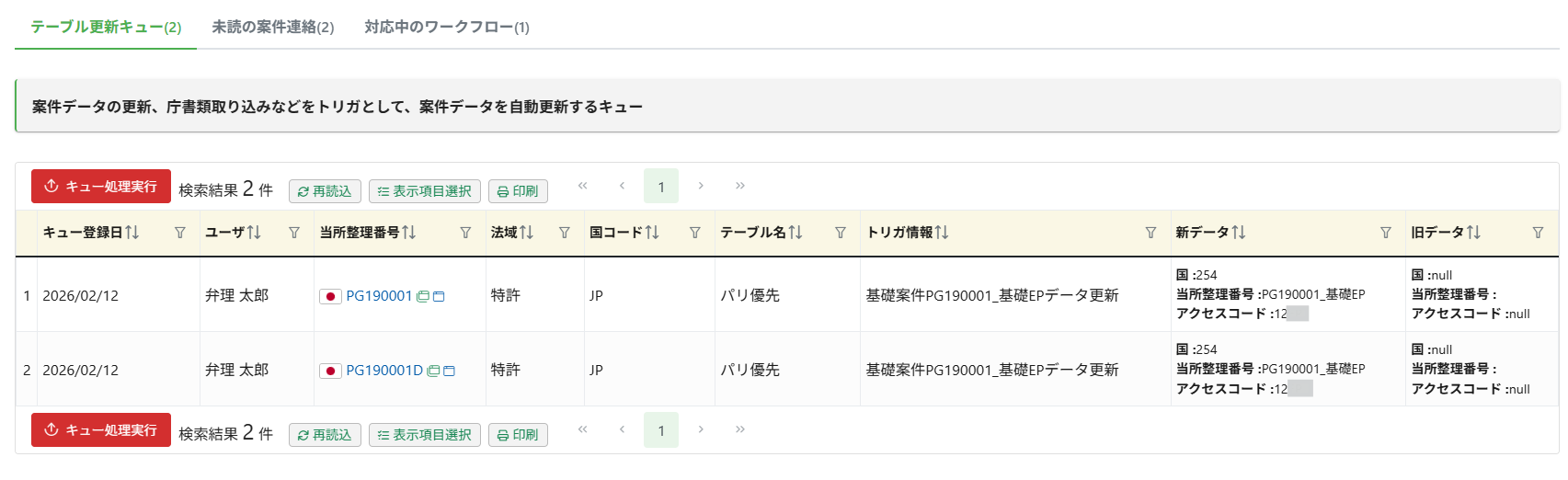子案件のパリ優先テーブルのアクセスコードを更新するキューができ、登録すると子案件のパリ優先テーブルにアクセスコードが反映されます。