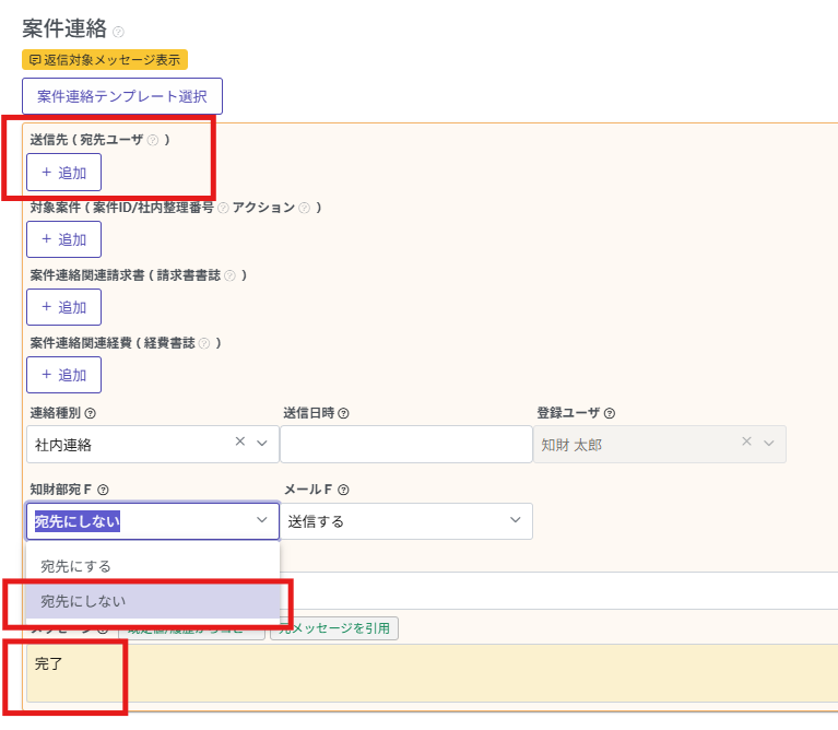 案件連絡作成画面で「知財部宛F」を「宛先にする」にセットし案件連絡を送ります。