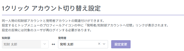 知財部アカウントと発明者アカウントが同一人物の場合、相互に関連付けができます。